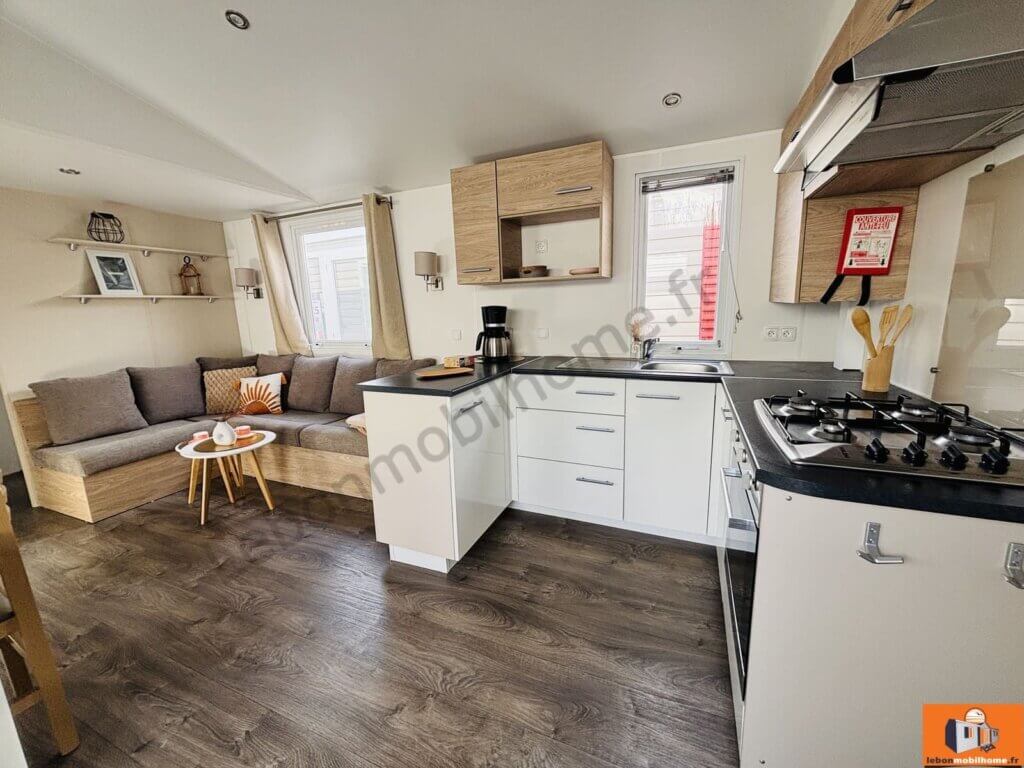 La cuisine équipée, avec son four intégré, répond à tous vos besoins pour cuisiner facilement. Ce modèle climatisé garantit un confort optimal, quelle que soit la saison !