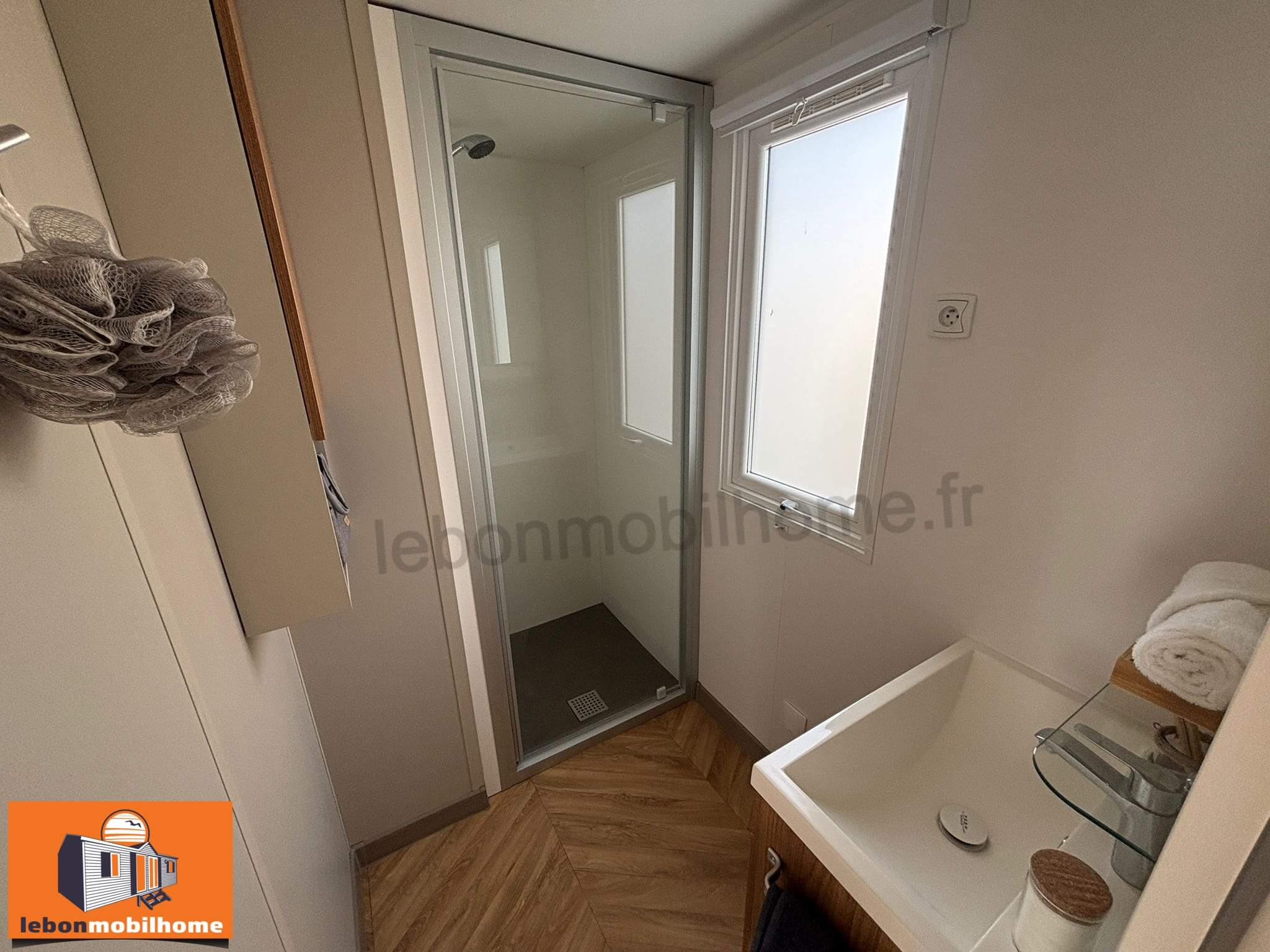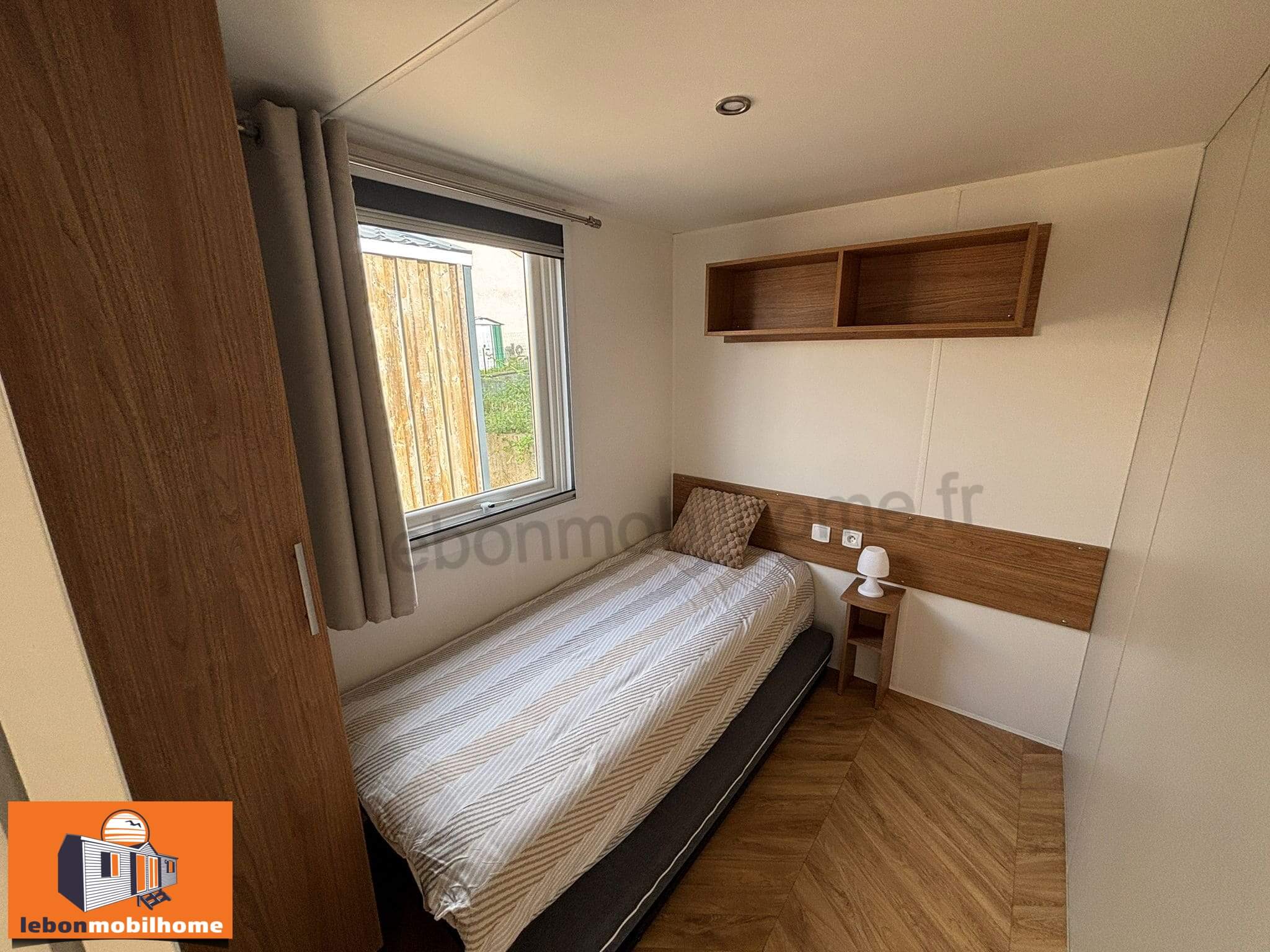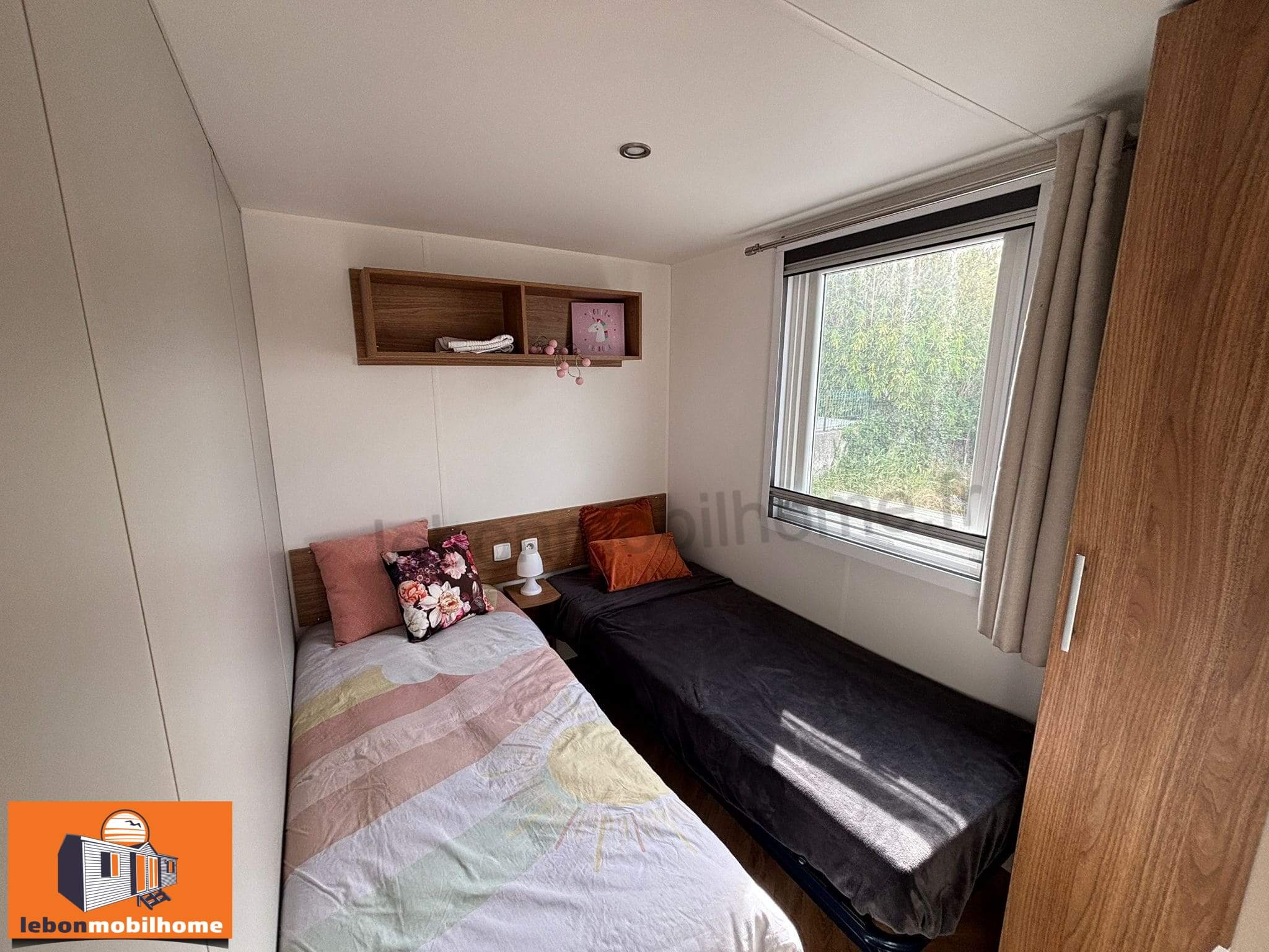 Ce mobil-home d’occasion de 37 m², surface habitable 31,80 m2 comprend trois chambres, une grande pièce de vie centrale et une cuisine entièrement équipée. Idéal pour une famille ou comme résidence secondaire, il est vendu clés en main, avec livraison et installation comprises.