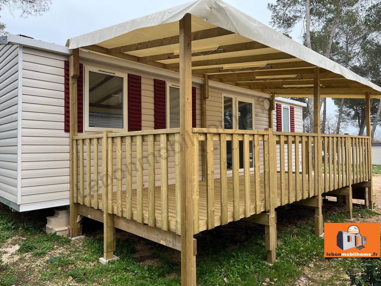 Ce mobil-home est vendu avec une terrasse déjà installée à l’avant, mesurant 6,00 m de long sur 2,60 m de profondeur, offrant ainsi un espace extérieur parfaitement aménagé pour profiter pleinement de votre séjour.