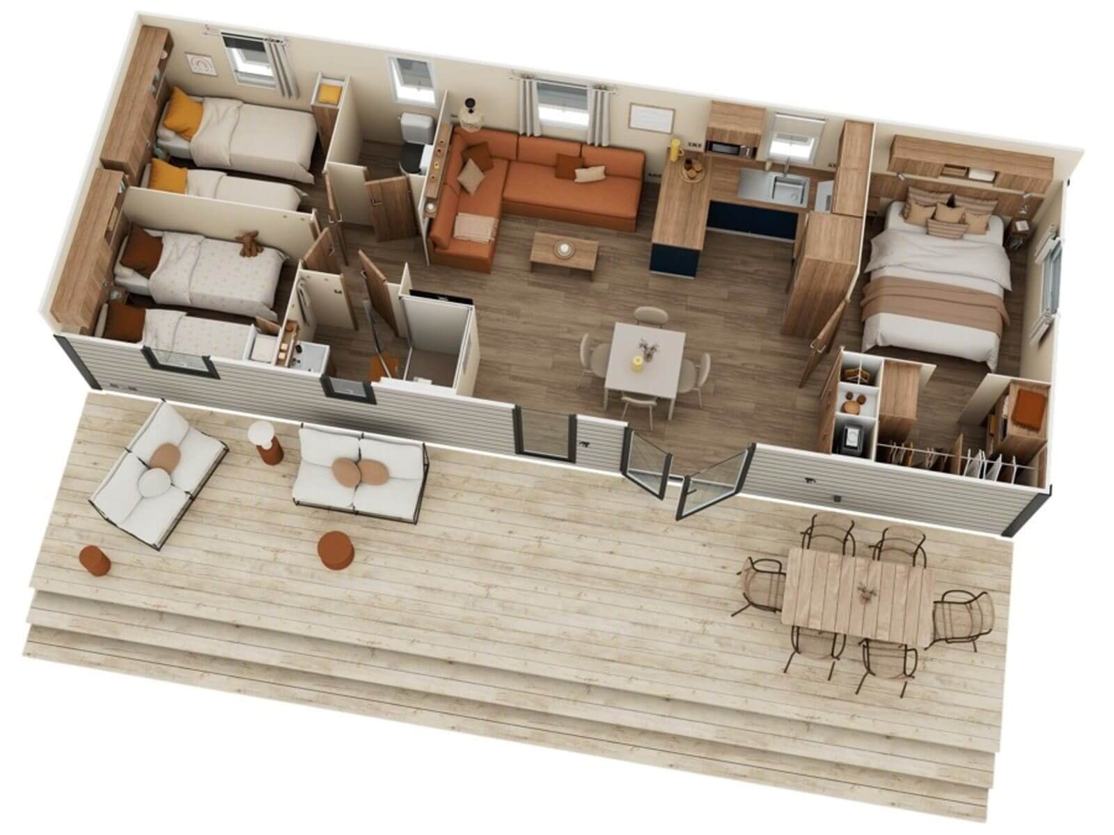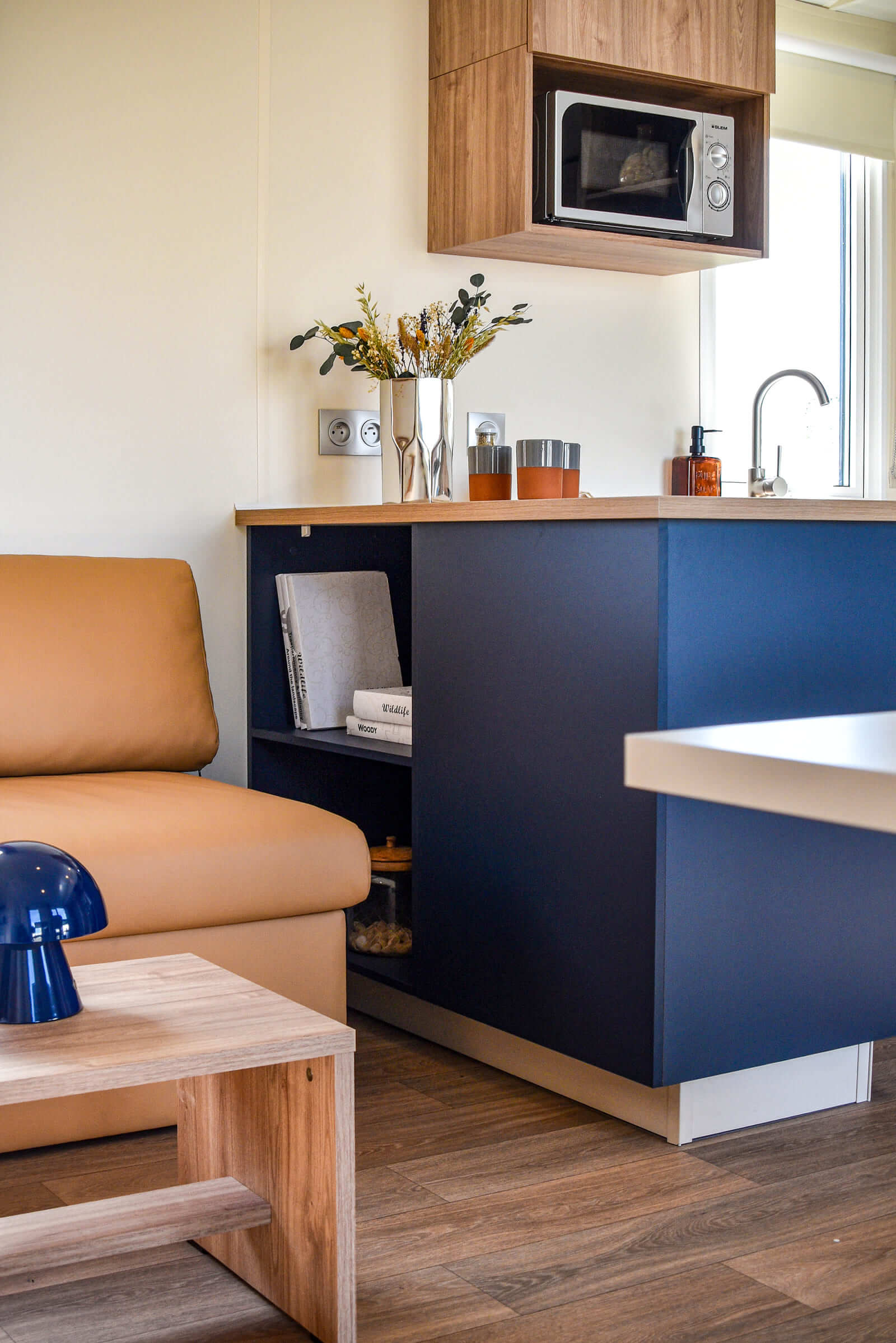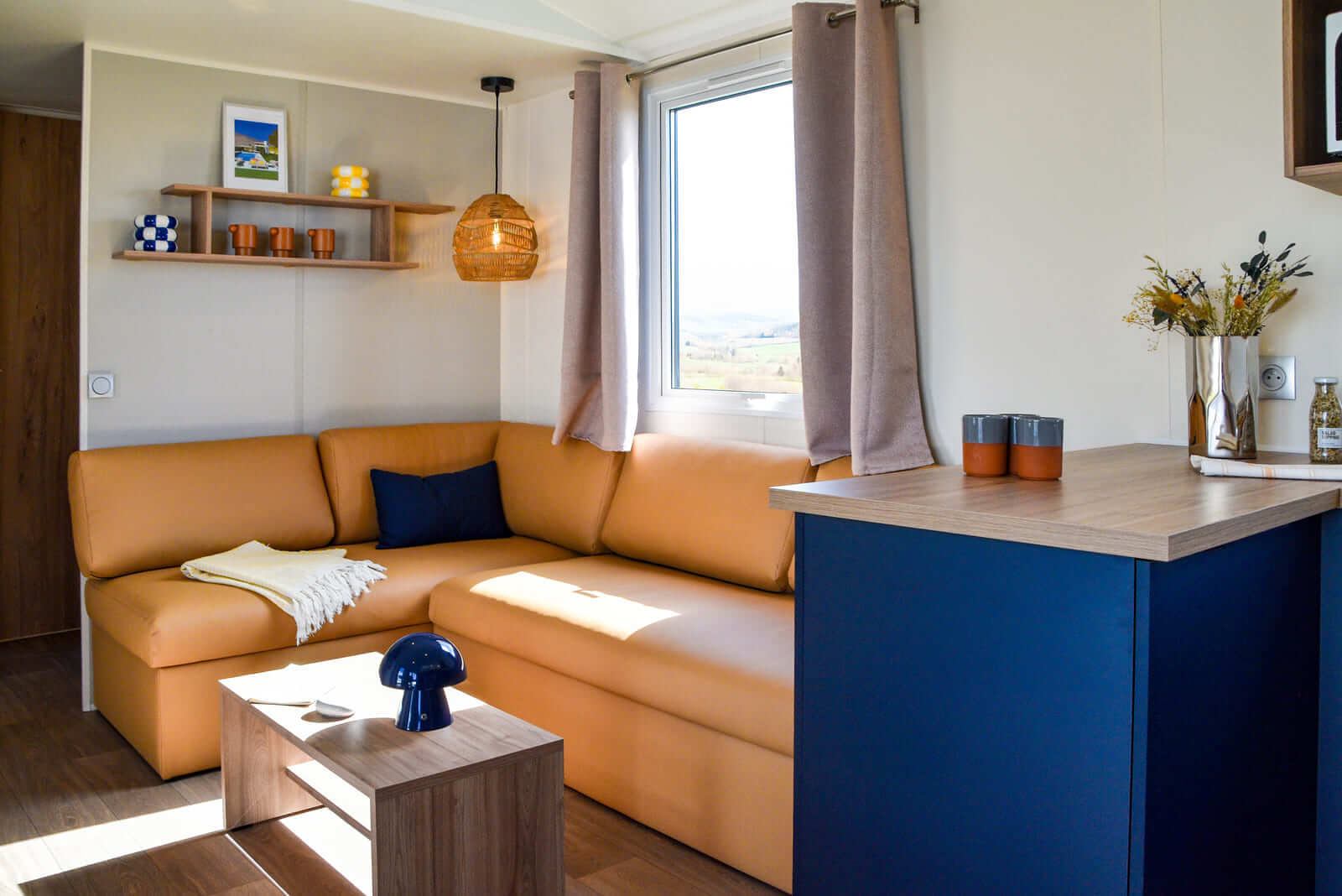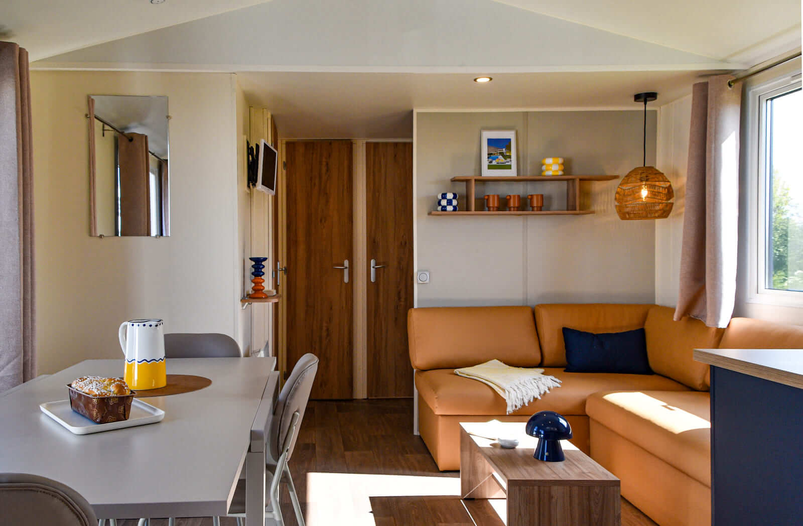 Dès l’entrée, un meuble de rangement surdimensionné avec penderie et étagères permet d’organiser facilement toutes vos affaires, un vrai plus pour les séjours prolongés. Le vaste salon lumineux, situé au cœur du mobil-home, devient un espace convivial pour partager des moments de détente et prolonger les soirées grâce à son agencement chaleureux.