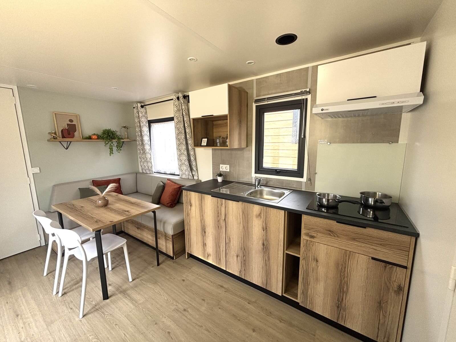 Mobil-Home moderne, double pente et menuiseries double vitrage.