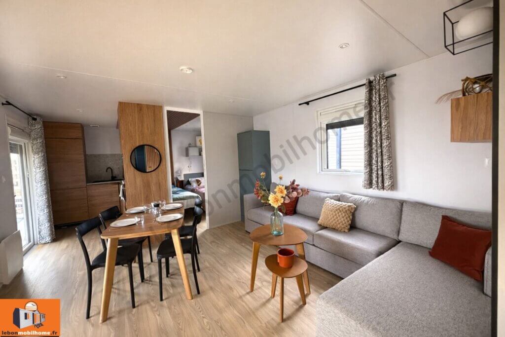 Le mobil-home Marin incarne l’esprit d’une véritable maison secondaire, où chaque espace a été pensé pour rimer avec élégance, confort et sérénité.