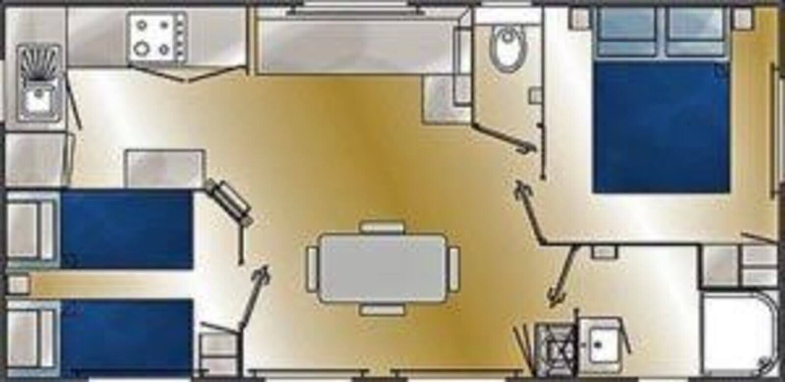Le mobil-home d’occasion Louisiane Savanah est un modèle spacieux et fonctionnel. Avec une surface de 33m2 et son implantation bien agencées, il dispose de deux chambres, dont une chambre parentale ainsi qu’une chambre enfant avec deux lits simple et d’une banquette convertible dans le salon parfaite pour accueillir des personnes supplémentaires.