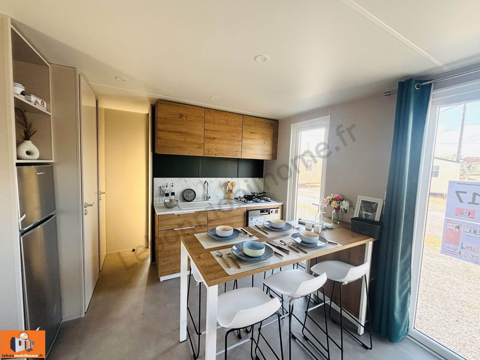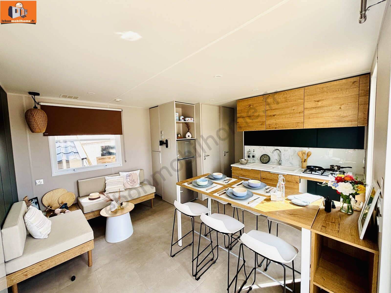Ce mobil-home se distingue par son design moderne, grâce à son toit monopente et son bardage PVC effet bois, qui imite à la perfection les tasseaux naturels. Une esthétique soignée qui séduira les amateurs de style contemporain.