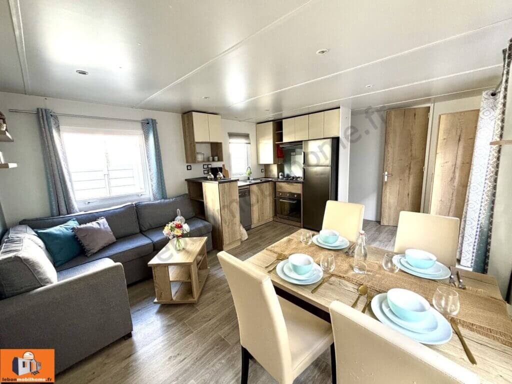 Dimensions hors tout 40m2, avec 37 m² de surface habitable, ce mobil-home d’occasion propose une configuration intérieure optimisée, avec des volumes généreux et une circulation fluide entre les différentes zones de vie. Chaque espace a été pensé pour offrir un maximum de confort et de praticité au quotidien, que ce soit pour de courts séjours ou une occupation à l’année.