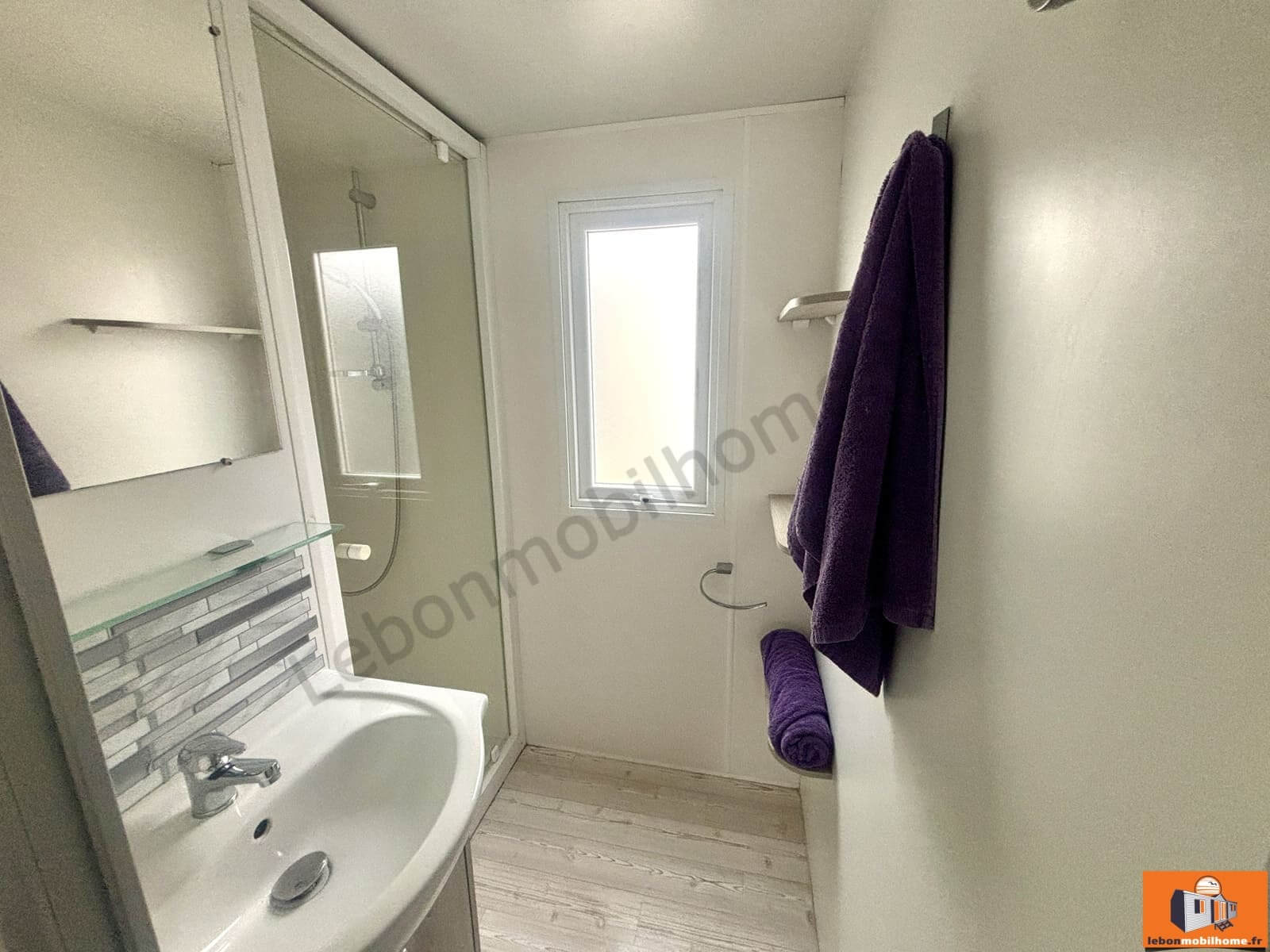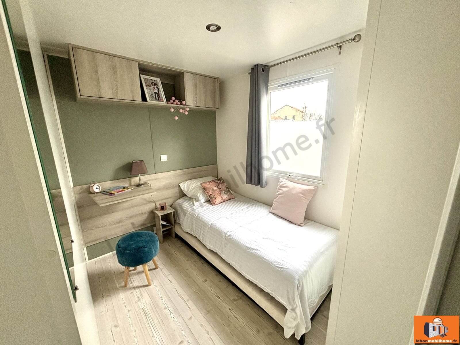 La partie nuit se compose de trois chambres, dont une chambre parentale avec salle de bains privative, garantissant intimité et confort. Les deux autres chambres disposent de rangements intégrés et une seconde salle de bains complète l’ensemble, un véritable atout pour les familles nombreuses ou la location saisonnière. La qualité de fabrication Trigano, l’agencement moderne et l’excellente finition font de ce modèle un mobil-home très recherché sur le marché de l’occasion récente.